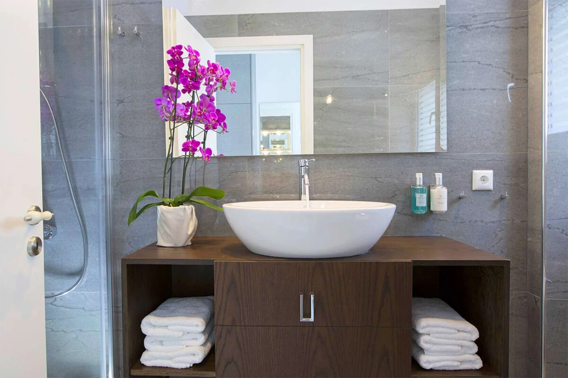 The ground floor unveils an exquisite kitchen and a spacious living room that opens up to a poolside oasis. A sleek sofa effortlessly transforms into a sumptuous double bed, complemented by an indulgent bathroom designed for pure relaxation.